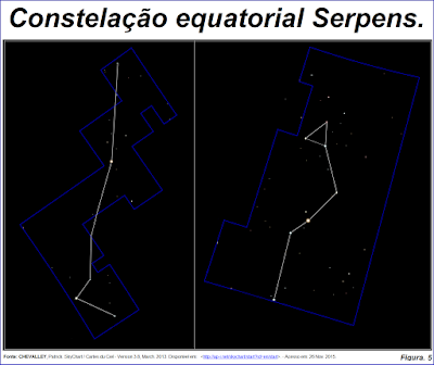 Companheiros e companheiras das jornadas observacionais! Esse certamente será um daqueles períodos que certamente ficarão marcados por algumas décadas como, excepcionais para a história da astronomia de um modo geral, sendo que: a profusão de eventos raros e importantes que estarão ocorrendo na esfera celeste, são de rara oportunidade e beleza e isso movimentará de forma proativa a maioria esmagadora dos partícipes e multiplicadores da ciência astronômica em todo o mundo de uma forma bastante significativa. Senão vejamos: Após 08 de novembro de 2006, será em 09 de maio próximo a primeira oportunidade que teremos de acompanhar de forma integral (em algumas regiões do planeta) a passagem de Mercúrio pelo disco solar (esse evento já registrado de forma exitosa na América do Sul em edições anteriores), neste intuito o colega Hélio de Carvalho Vital da Seção Lunissolar da REA (Rede de Astronomia Observacional)/Brasil, elaborou um projeto observacional bastante interessante (Detalhes em: https://sky-observers.blogspot.com/2024/05/projeto-de-observacao-transito-de.html), juntamente com um software (Download gratuito disponível em: http://www.geocities.ws/lunissolar2003/Helios_Transits.zip). Então o ato de observar e informar aos seus amigos e colegas já é uma multiplicação muito boa em favor da ciência. Para os mais atentos, Marte ainda dentro deste período, estará em uma de suas oposições favoráveis sendo que também sua máxima aproximação a Terra ocorre neste período também; e o que observar a partir de instrumentos baseados na superfície terrestre e principalmente com instrumental de pequeno e médio porte? Uma ótima sugestão será verificar os programas observacionais já realizados onde a participação de astrônomos (as) amadores sempre é de grande importância e o texto do Professor Frederico Luiz Funari da REA/Brasil (veterano observador de Marte) ilustra de forma sine-qua-non um imperdível post sobre o registro de nuvens naquele planeta. Talvez seja justamente a nossa conhecida “Star hopping” a técnica mnemônica mais utilizada entre nós para a localização e identificação das estrelas mais brilhantes na esfera celeste, que levaram alguns integrantes do Grupo de Reconhecimento e Estudos do Céu a visualização de uma grande quantidade de estrelas e constelações durante a última Star Party do Centro de Estudos Astronômicos de Minas Gerais (CEAMIG), realizada em 09 de abril último no Observatório Wykrota; veja a linda fotografia de NGC 3372, realizada naquela oportunidade. Antecipando-me a algumas ocorrências apresento neste mês Serpens (Caput e Cauda), uma região celeste que surpreendeu e ainda causa admiração em muitos observadores.